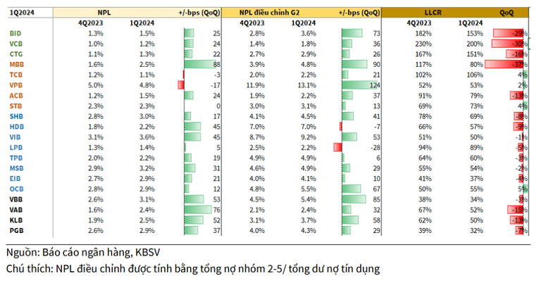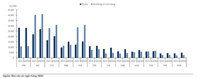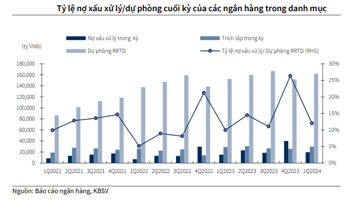 Để duy trì bộ đệm an toàn, các ngân hàng này cũng đã tăng trích lập 15% so với cùng kỳ, tương ứng 3% so với thời điểm cuối năm 2023. Dù vậy, KBSV cho rằng áp lực trích lập sẽ vẫn còn lớn do các ngân hàng dự kiến sẽ tiếp tục xử lý nợ xấu trong thời gian tới.